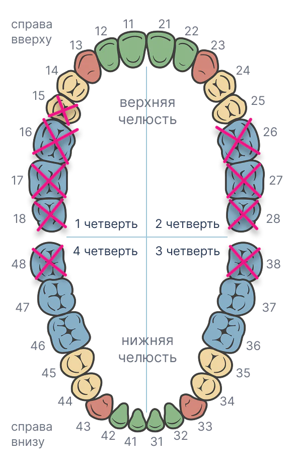 1 класс по Кеннеди ВЧ, моляры и премоляры верхней челюсти утеряны в результате осложненного кариеса;