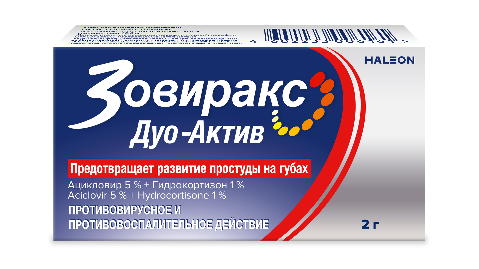 Препарат Зовиракс Дуо-Актив обладает двойным действием: противовирусным и противовоспалительным:2